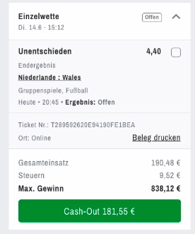 Die Quoten müssen erfreulicher Weise keinen Vergleich mit der Konkurrenz scheuen. In unserem Test stehen die Admiralbet Quoten denen von Betway, Bwin oder Bet365 in keinster Weise nach. Im Vergleich zu Tipico und Winamax, wo die Wettsteuer in Höhe von 5% für Sie übernommen wird, wird diese bei Admiralbet von den Einsätzen abgezogen. Platzieren Sie also eine 10€ Wette zur Quote 2,00, wird Ihre Wette mit 9,50€ berechnet, woraus sich ein Gewinn in Höhe von 19€ ergibt.