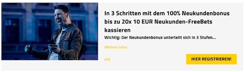 Mit der 3. Einzahlung könnt ihr bis zu 100€ in Form von 10 x 10€ Gratiswetten kassieren.