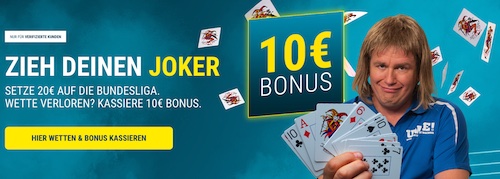 Ab einer Einzahlung von 10€ gibt es hier einen 100% Bonus und oben drein noch einen 10€ Freebet für alle berechtigten Bestandskunden. Maximal könnt ihr mit einer 100€ Einzahlung weitere 100€ Bonus erhalten und die obligatorische 10€ Freebet kassieren. Tolles Angebot und fast so gut wie der eigentliche Bonus den es sonst nur für Neukunden gibt!