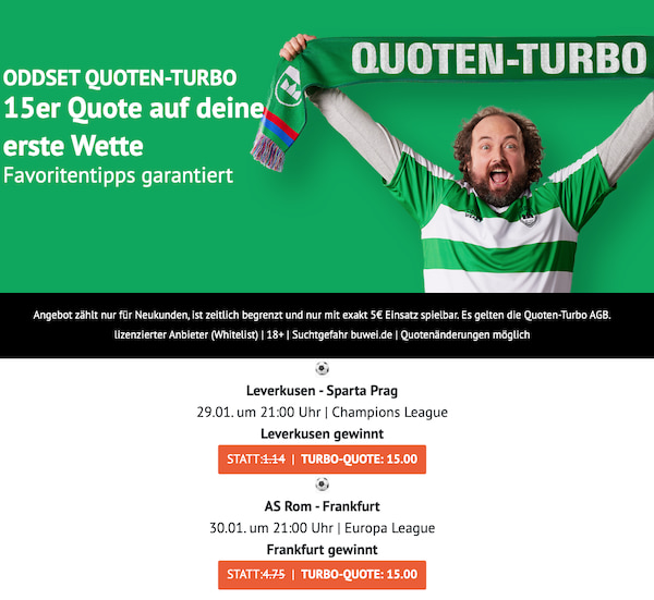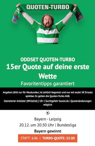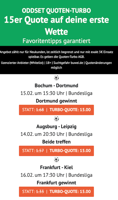Für das anstehende Wochenende rüstet ODDSET erneut mächtig auf. Der Anbieter stellt Neukunden gleich sechs Partien mit der Quote 20,0 in Aussicht. Entscheide dich nun für deine ideale Option und löse die Quote 20,0 mit 5€ Einsatz auf einen der ausgewählten Wettmärkte ein. Per Klicke auf den Banner gelangst du direkt zu den ODDSET Quoten-Turbos für den anstehenden Spieltag in den höchsten Spielklassen Deutschlands: