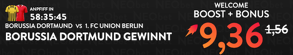 Bei NEO.bet wetten Neukunden nun mit einem starken 200% Boost auf das Pokal-Duell Dortmund vs. Leverkusen. Anstoß der Begegnung ist am Dienstagabend um 21:00 Uhr im Signal Iduna Park und Neukunden des Anbieters wetten nun mit erhöhter Quote auf einen Erfolg der Dortmunder. Klicke auf die Promotion und aktiviere mit 10€ Einsatz deinen Wettbonus auf das Achtelfinal-Duell BVB vs. B04:
