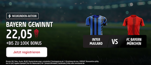Quote 100 (!) bei Tipico! Ja, richtig gelesen – Der deutsche Anbieter stattet einen Siegestipp auf den FC Bayern München im Auswärtsspiel gegen Union Berlin mit einer wahren Mega-Quote aus. Das Pokal-Duell steigt diesen Mittwochabend um 20:45 Uhr in der Hauptstadt Deutschlands und mit 1€ Einsatz können sich alle Neukunden von Tipico diese unglaubliche Quote sichern. Klicke auf den Banner, platziere deine erste Wette und komme in den Genuss des Mega-Deals für den anstehenden Pokal-Fight!